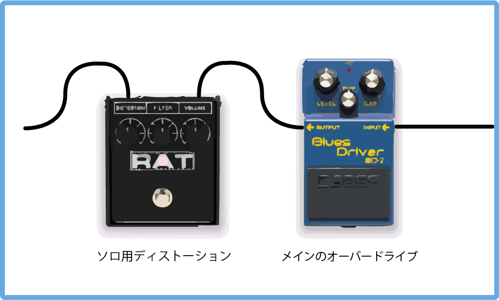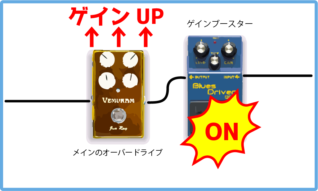 | ゲインブースター | 後段のペダルをプッシュし、歪みの密度とサステインを稼ぐ |