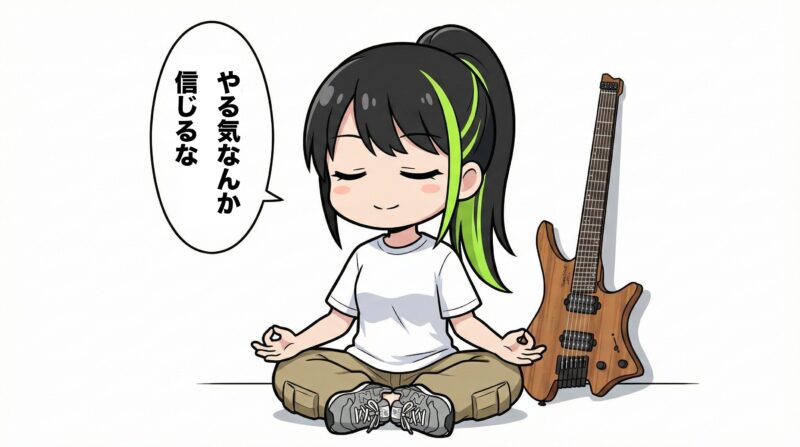 今すぐギターをケースから出し、一番目立つ場所に置いてください。そして、弦をジャラーンと一度だけ鳴らして、「俺(私)、今日もギターやったわ」と独り言を言ってください。