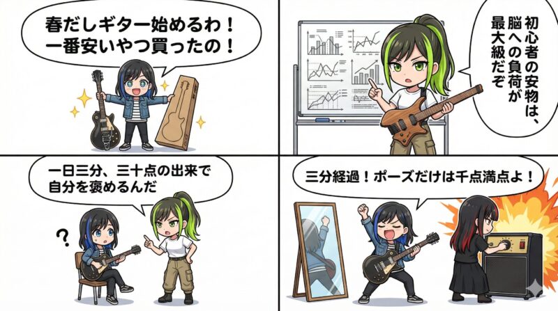 基礎練習は「飽きたら即中止」: つまらない練習を無理に続けると、脳が「ギター=苦痛」というリンクを貼ってしまいます。