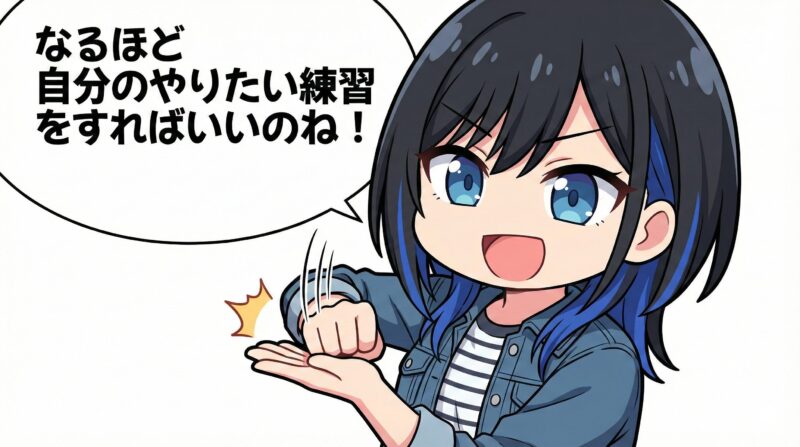 じゃあ、今日は難しいスケール練習はやめて、好きな曲のサビだけジャカジャカ弾いて「私最高!」って思うことにするわ!