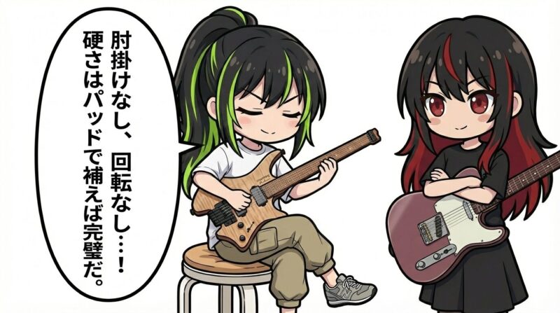 ギターを構えるスペースを確保し、右腕・左腕の可動域を広げるため(最重要)。 - 背もたれがない:
