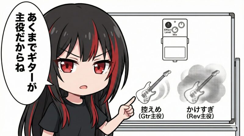 長い残響を大きく出すと、次の音を弾いたときに前の残響が重なり、音が団子になります。これを防ぐには「長くするなら薄く」が鉄則です。