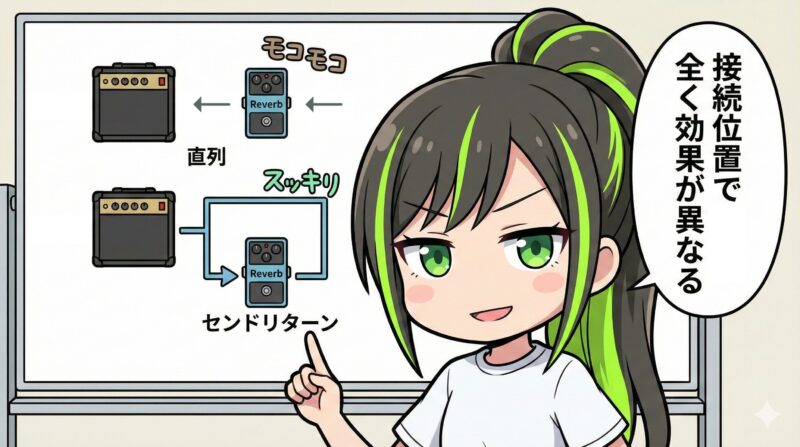 結論から言うと、リバーブは「アンプのセンドリターン(エフェクトループ)」に繋ぐのが最もポテンシャルを引き出せる接続位置です。