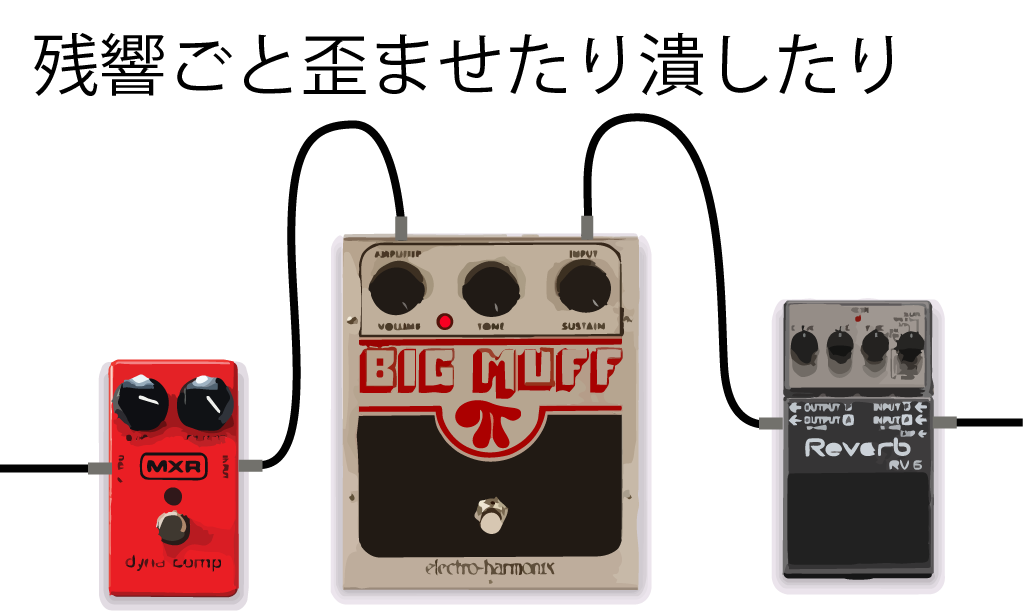 | 歪みの前段 | シューゲイザー特有の「轟音」や「カオスな質感」が作れる。 | 一般的な演奏では使い物にならないほど音が潰れる。 |