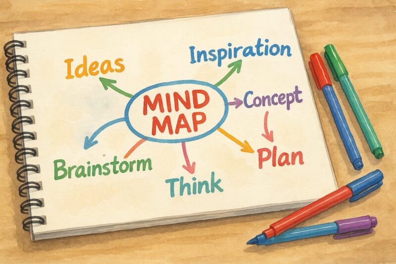 ↓マインドマップは大判のスケッチブックにカラーのマッキ―で書くとより多くのアイディアが出せるのでおすすめ。