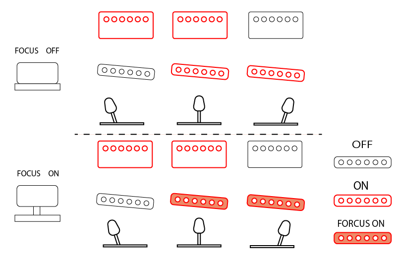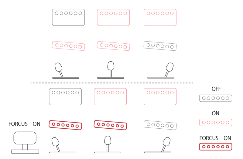 「フォーカススイッチ」はリアシングルのミッドをブーストさせることで言わば疑似ハムに変えるという真逆のアプローチをとっています。